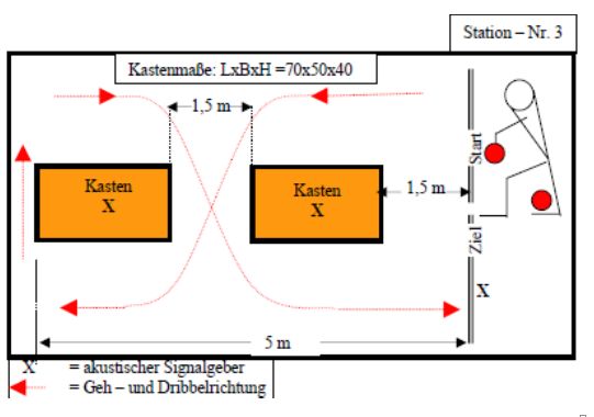 Prelle einen Basketball über die Distanz von 2x5 Meter um zwei Hindernisse, kleiner Kasten, siehe Zeichnung. Jeder Teilnehmer