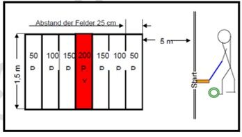 Wertung: Jeder TN hat drei Versuche, der beste „Wurf“ wird gewertet. Alle Weiten werden addiert.