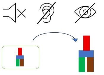 Drei TN der Gruppe bilden ein Team. Person A darf nicht sprechen, Person B darf nicht hören, Person C darf nicht sehen. Vor Person A liegen drei Spielkarten mit unterschiedlichen Bauaufgaben. Vor Person C sind 10 Bauklötze in verschiedenen Farben. Person A nimmt eine Spielkarte und erklärt Person B, was auf der Karte drauf ist bzw. was gebaut werden soll. Person C baut die Klötze auf.