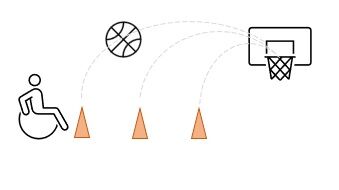 Drei TN sitzen im Rollstuhl, es gibt einen Basketball. Die TN werfen nacheinander auf den Korb. Die anderen TN müssen die Bälle holen und zurückwerfen. Ziel ist es so viele Körbe innerhalb einer bestimmten Zeit zu werfen wie möglich.