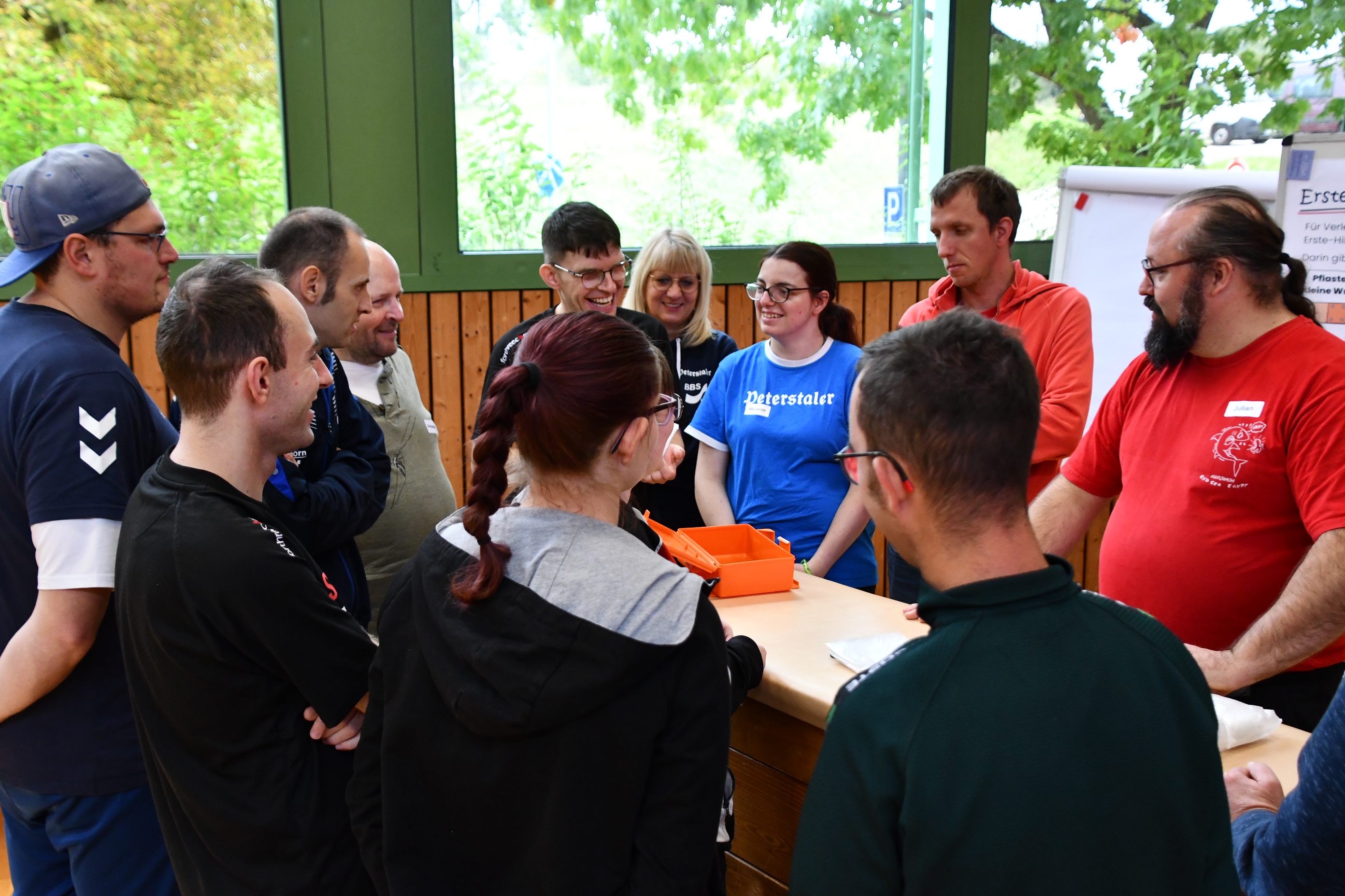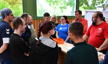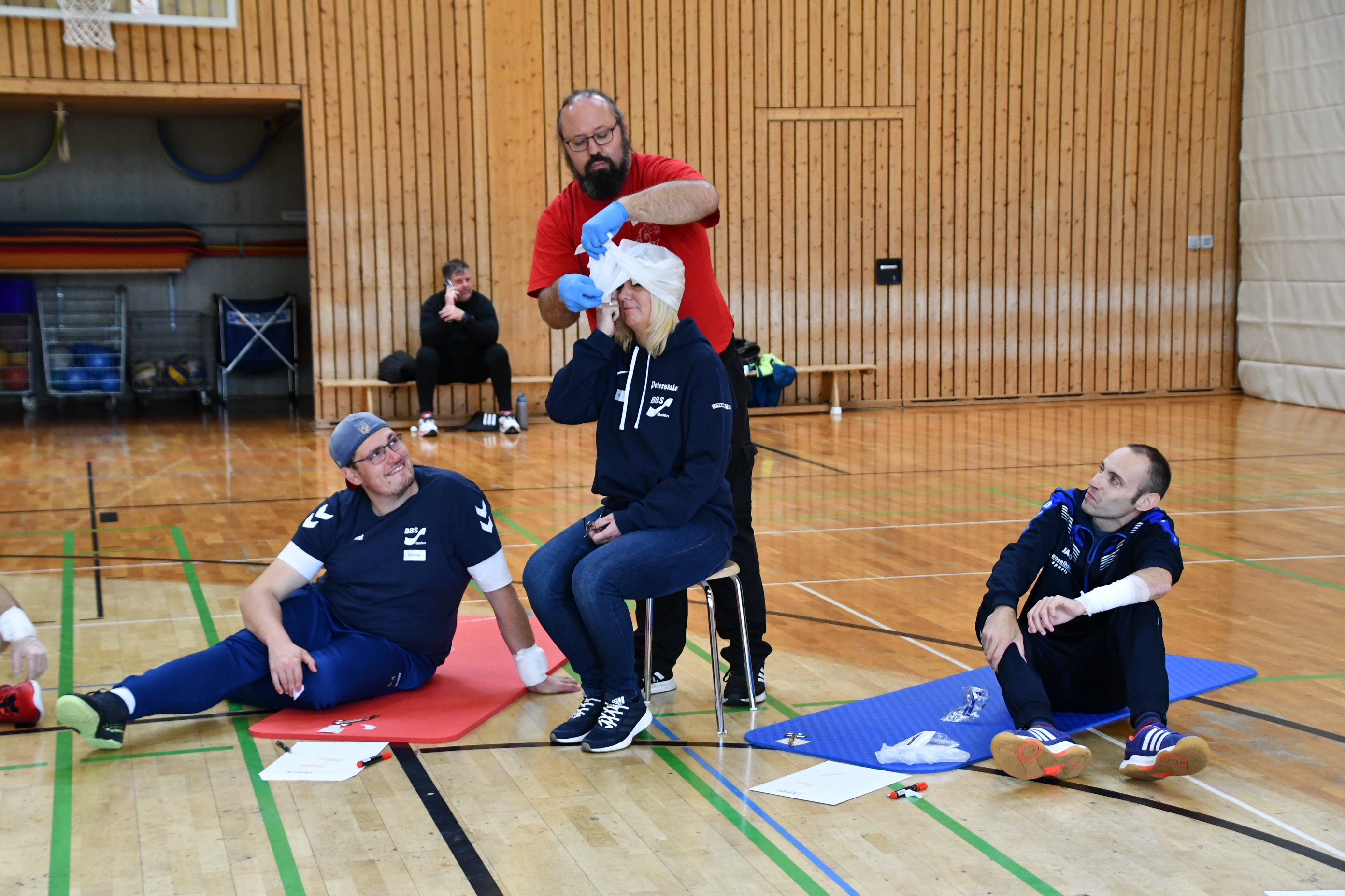 Das Tageshighlight war zweifellos die Behandlung einer mit Theaterschminke simulierten Kopfverletzung. Praxisnah setzten die Teilnehmenden einen Notruf per Walkie-Talkie an die Leitstelle ab. Die Teilnehmenden stellten in dieser Notfallsituation das während des Tages erworbene Wissen unter Beweis und setzten alle Glieder der Rettungskette um. So wurde die verletzte Person beispielsweise mit Rettungsdecke und Verband versorgt, getröstet und in die stabile Seitenlage gebracht.
