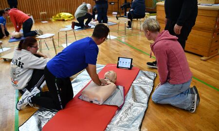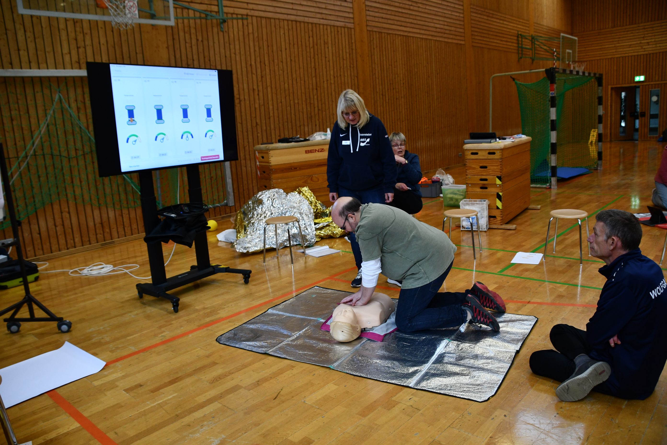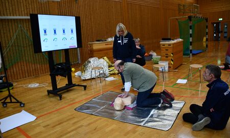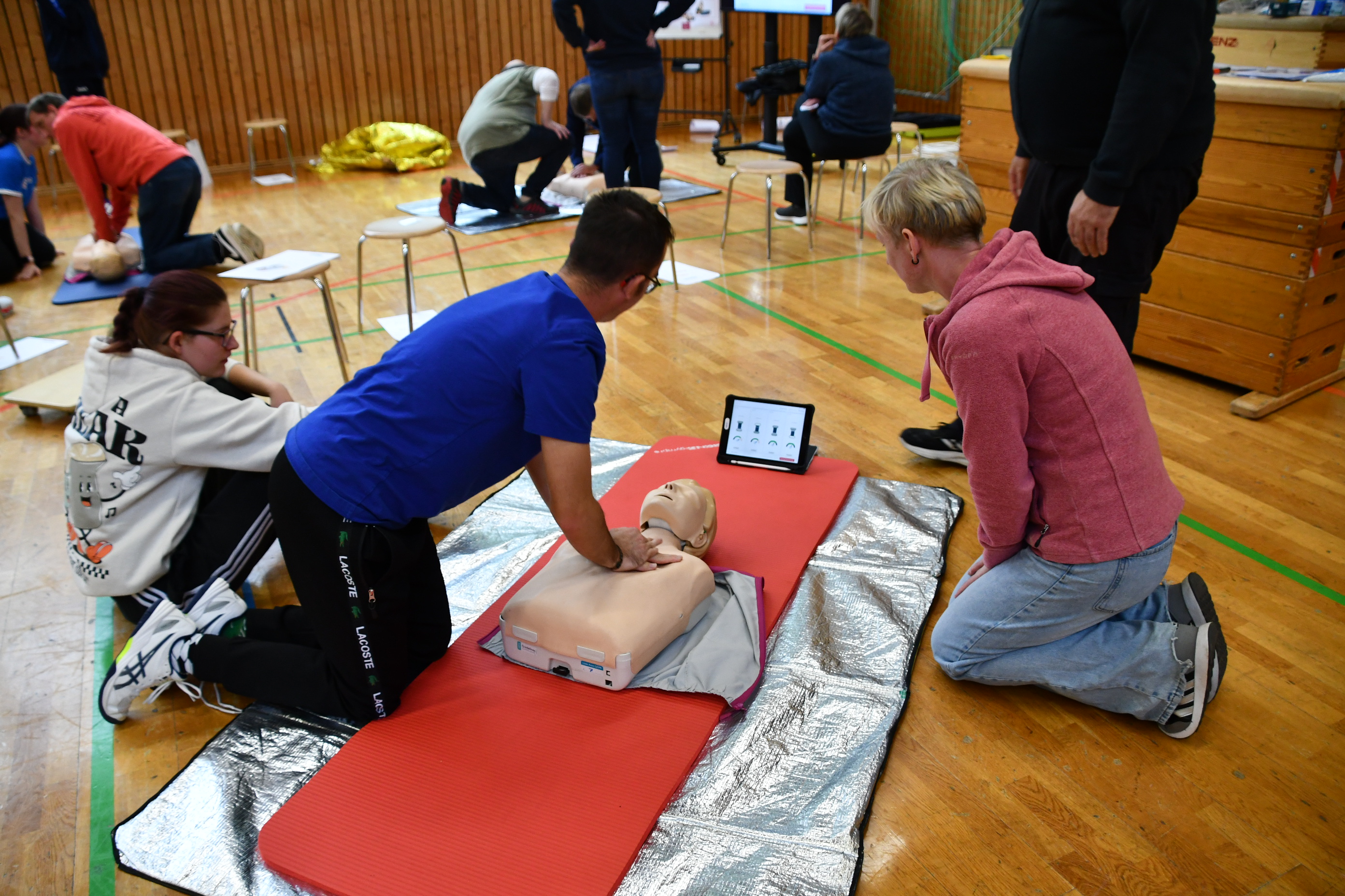 Die Teilnehmenden konnten das theoretisch vermittelte Wissen in zahlreichen praktischen Übungen anwenden und Notfallsituationen realitätsnah nachstellen. Besonders beeindruckt zeigte sich die Gruppe von der Herzdruckmassage an der Reanimationspuppe Anne – vielen wurde bewusst, wie anstrengend diese Maßnahme tatsächlich ist. Jeder hatte die Möglichkeit, die Reanimation an vier Puppen ausgiebig zu üben und zu verbessern. Ein Tablet gab dabei wertvolle Hinweise, ob schneller, langsamer, fester oder sanfter gedrückt werden musste.