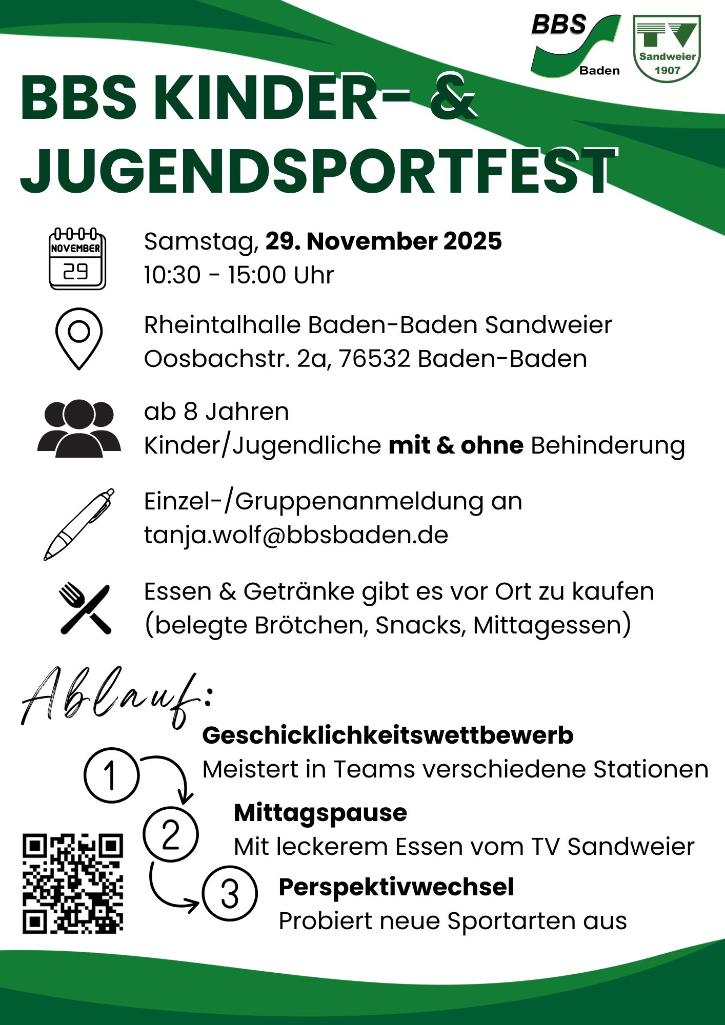 Weitere Infos sowie die Ausschreibung und das Anmeldeformular findet ihr hier: https://www.bbsbaden.de/jugendsportfest
