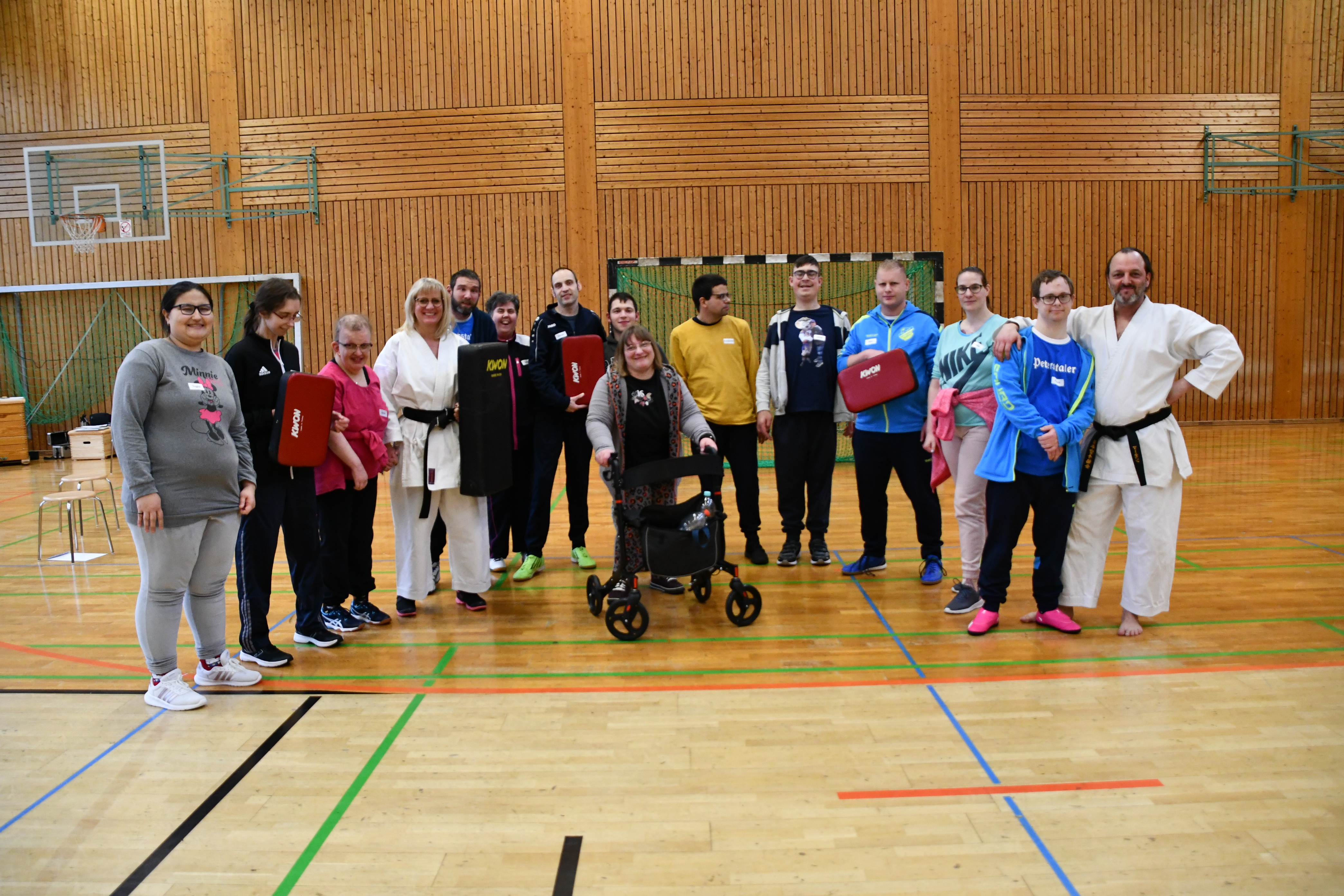 Bereits aus der Vorstellungsrunde ging hervor, dass der Bedarf für diese Schwerpunkte für die Zielgruppe äußerst wichtig ist. Mehrere Teilnehmende berichteten von negativen Erfahrungen mit körperlicher und seelischer Gewalt. In der Fortbildung wurden sie über ihre Rechte aufgeklärt und lernten sich in Gewaltsituationen zu behaupten und zu verteidigen. „Nein“ zu sagen und Grenzen zu setzen ist dabei der Kernpunkt der Prävention und kann potenzielle Täter von der Ausübung körperlicher als auch seelischer Gewalt abhalten. Gemeinsam mit den Teilnehmenden wurden die eigenen Stärken und Kompetenzen erarbeitet und gleichzeitig vermittelt, diese selbst wertzuschätzen und auf sich selbst stolz zu sein. In spielerischen Übungen wurde darüber hinaus auch am Einsatz der Stimme gearbeitet und die gegenseitige Hilfsbereitschaft thematisiert. Alle Lehrgangsinhalte wurden für die Zielgruppe verständlich aufbereitet und vermittelt. „Weil Bildung keine Grenzen kennt, haben wir alle Lehrmaterialien in Leichter Sprache konzipiert“, erläutert Sport-Inklusionsmanagerin Kim Früh die Herangehensweise des BBS. Am Nachmittag konnten sich die Teilnehmer in der Selbstverteidigung ausprobieren. Mit Schlägen auf Pratzen und Polster, angeleitet von Kim Früh und Martin Messner vom Budo-Kai Bühlertal (1. DAN Karate), überwanden die Teilnehmer ihre Hemmungen und lernten darüber hinaus, wie man in Notsituationen Schläge abwehrt.